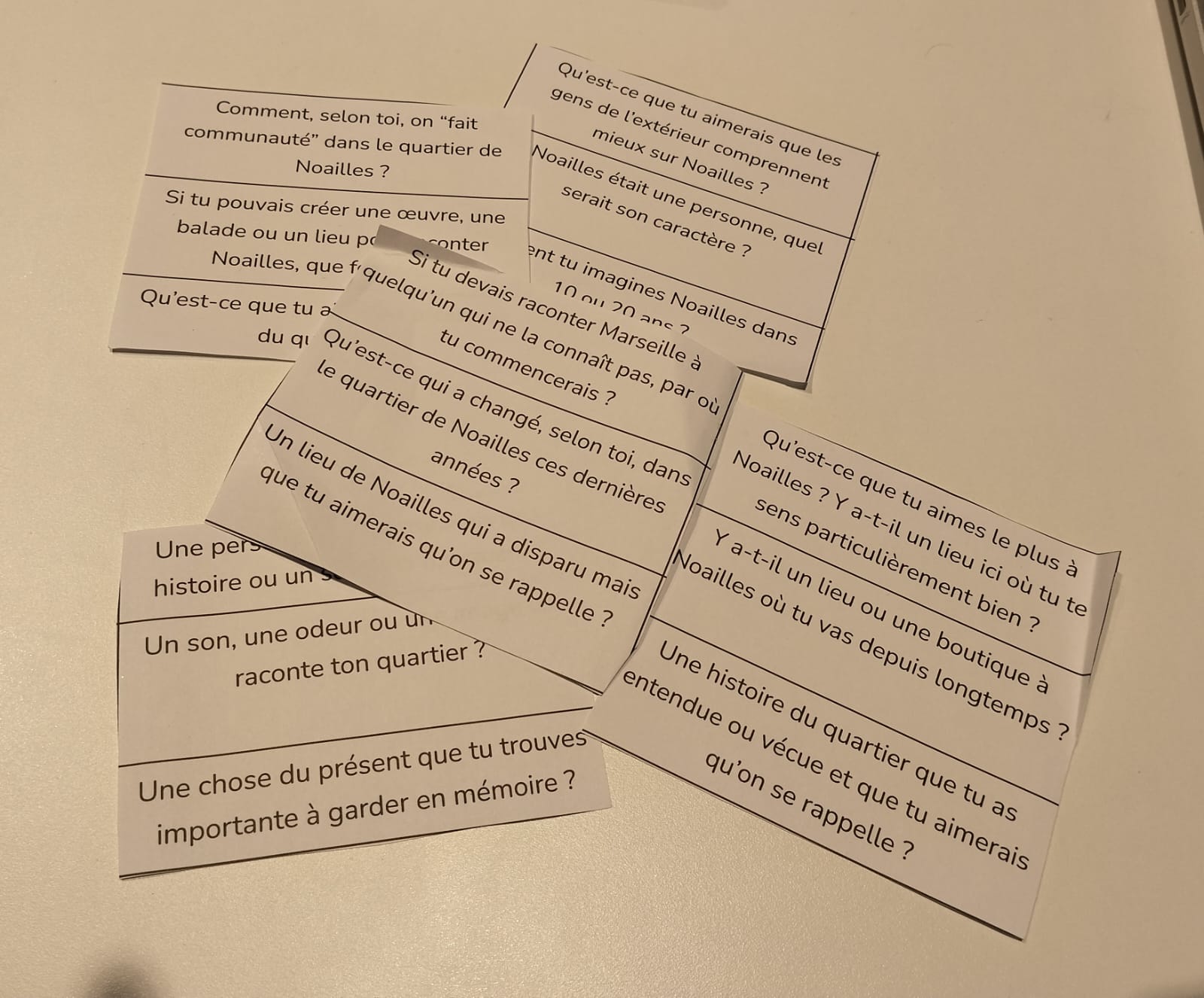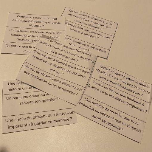 Le 3 octobre, nous nous sommes retrouvées une nouvelle fois pour réfléchir à une manière de rencontrer les habitant·es avec lesquel·les nous allons co-construire notre balade. Nous avons alors décidé de participer à la fête du quartier de Noailles, qui aura lieu le 15 octobre. Le but de cette journée sera de faire connaître notre projet aux passant·es et d’échanger directement avec les habitant·es du quartier.