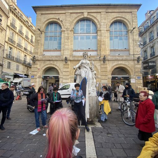 Puis, Eugénie se lance dans l’explication de la Folle histoire de Marseille. Après avoir expliqué les enjeux de ce projet, Louise propose une maquette de la balade. José est directement inspiré : il veut parler de la place des Hall Delacroix, où il allait acheter son poisson dans sa jeunesse. Rachid, un jeune de Because U Art, veut parler des effondrements du 05 novembre 2018.